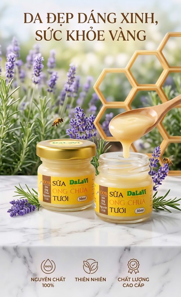 Sữa ong chúa tươi 100% giúp sinh sản tế bào da mới, làm chậm quá trình lão hóa, giảm căng thẳng mệt mỏi và làm chậm lại các quá trình thay đổi nội tiết tố, mụn trứng cá…Tất cả những vấn đề này sẽ hoàn toàn được xử lý khi bạn sử dụng sữa ong chúa.
