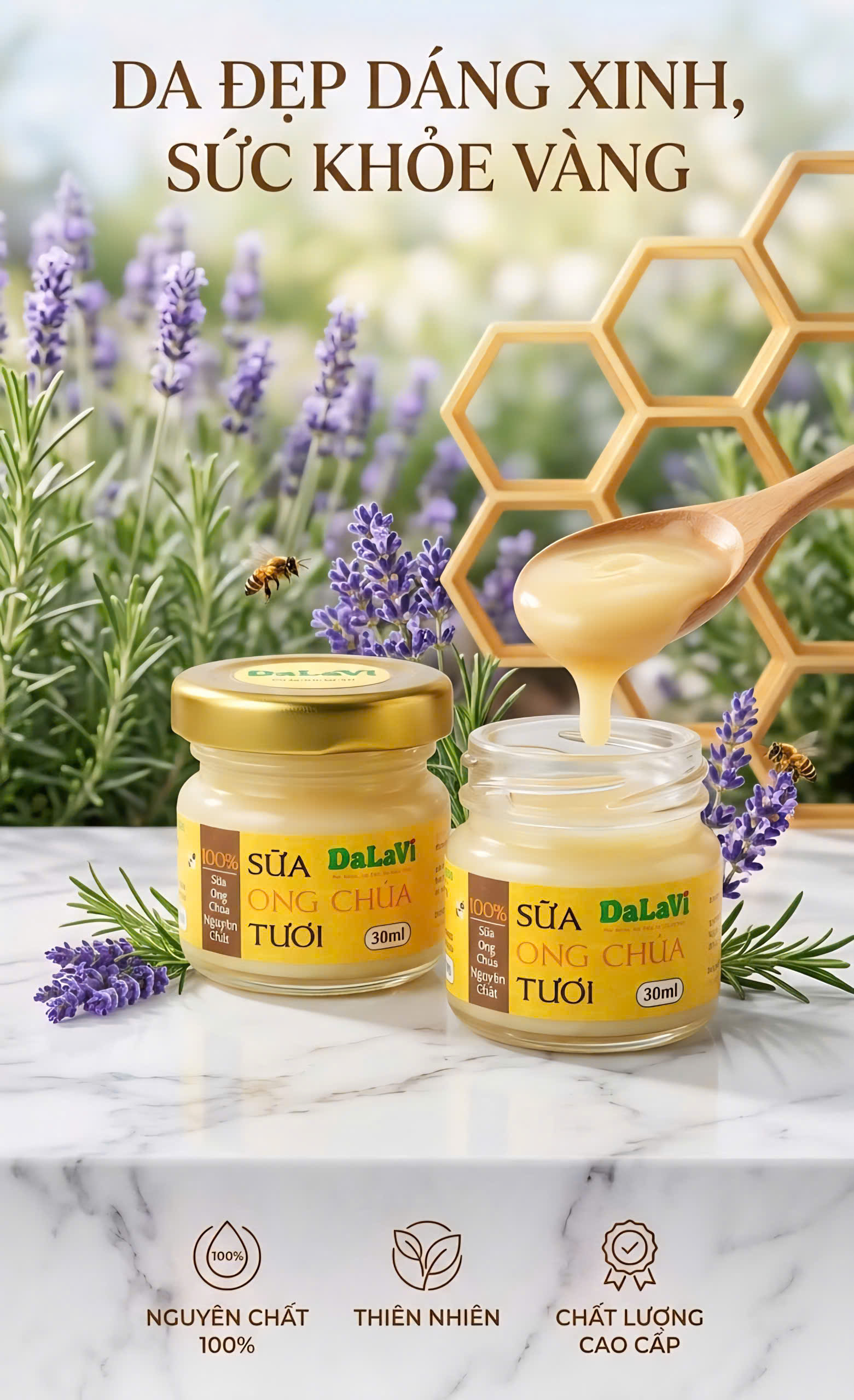 Sữa ong chúa tươi 100% tự nhiên có màu vàng nhạt, được các ong thợ sản sinh ra và là nguồn thức ăn chính cho ong chúa và ấu trùng của chúng. Đó thực chất là một hỗn hợp gồm mật ong, các enzym và phấn hoa. Sữa ong chúa có rất nhiều lợi ích cho sức khỏe của con người. Nó giúp sản sinh năng lượng, đẩy lùi quá trình lão hóa và quan trọng nhất là tăng khả năng miễn dịch.